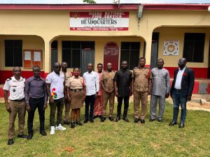 The delegation’s first point of call was the Ahafo Regional Fire Service Headquarters in Goaso, where they were warmly welcomed by the Regional Fire Commander and his team. As this marked the Regional Director’s first official visit, it served as a symbolic and strategic engagement. Discussions focused on the upcoming launch of the Fire Assistance Module portal, with both parties exploring ways to guide prospective applicants through the process and ensure their proper orientation, supported by professional input from the fire service.